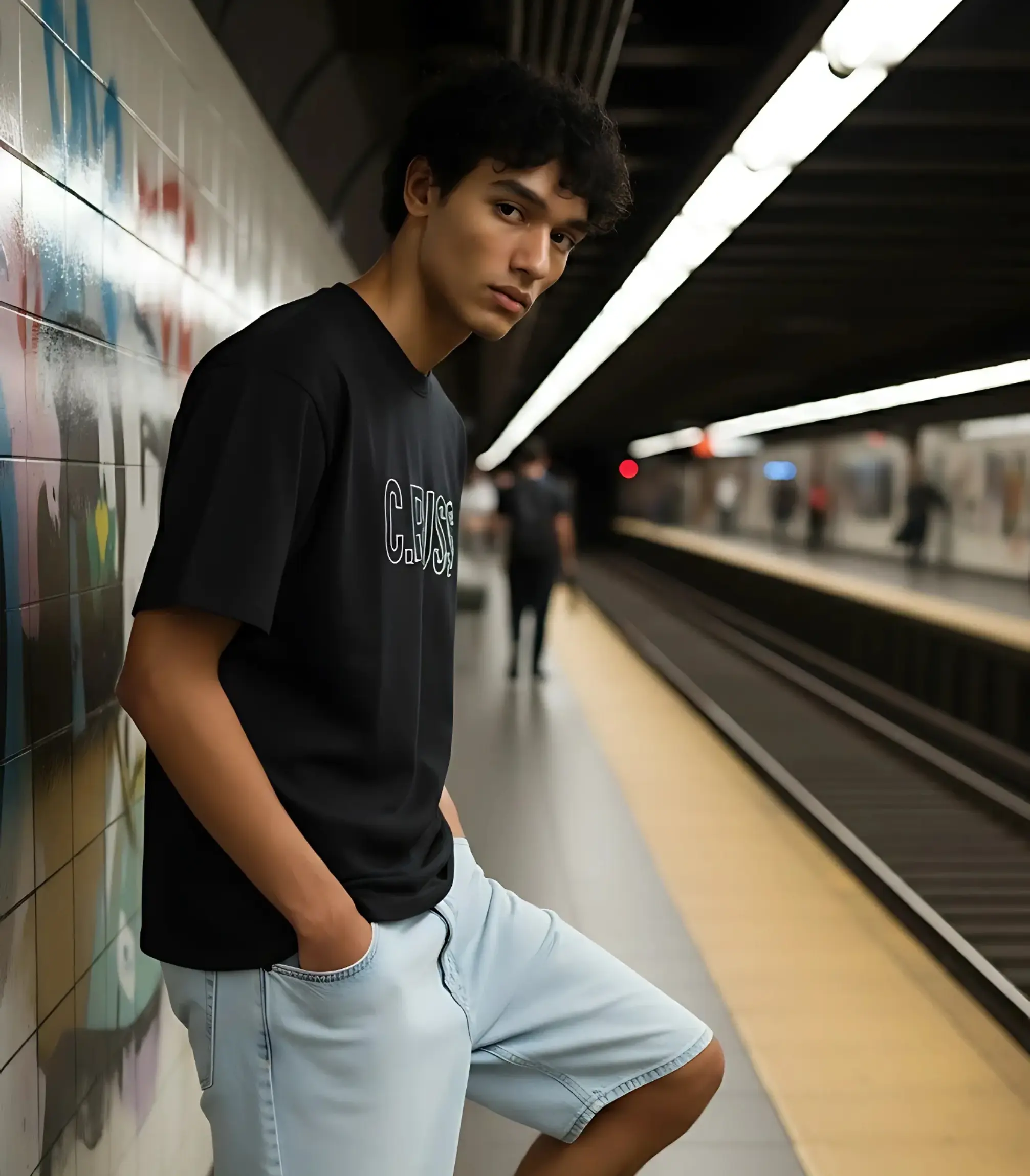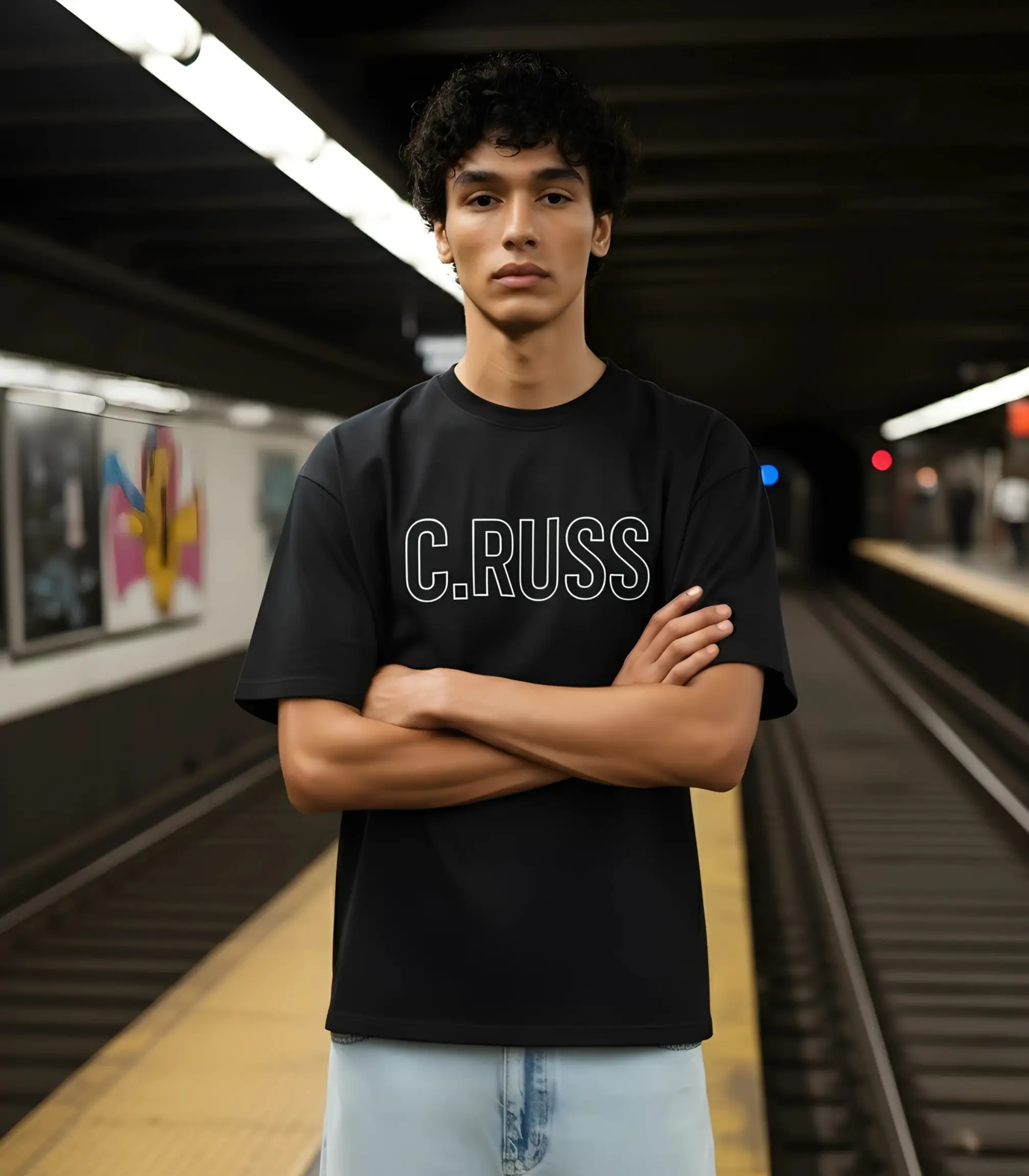 Camiseta negra de corte regular con logo C.RUSS LQDLT en tipografía lineal. Confeccionada en algodón premium, perfecta para un look urbano discreto y versátil.