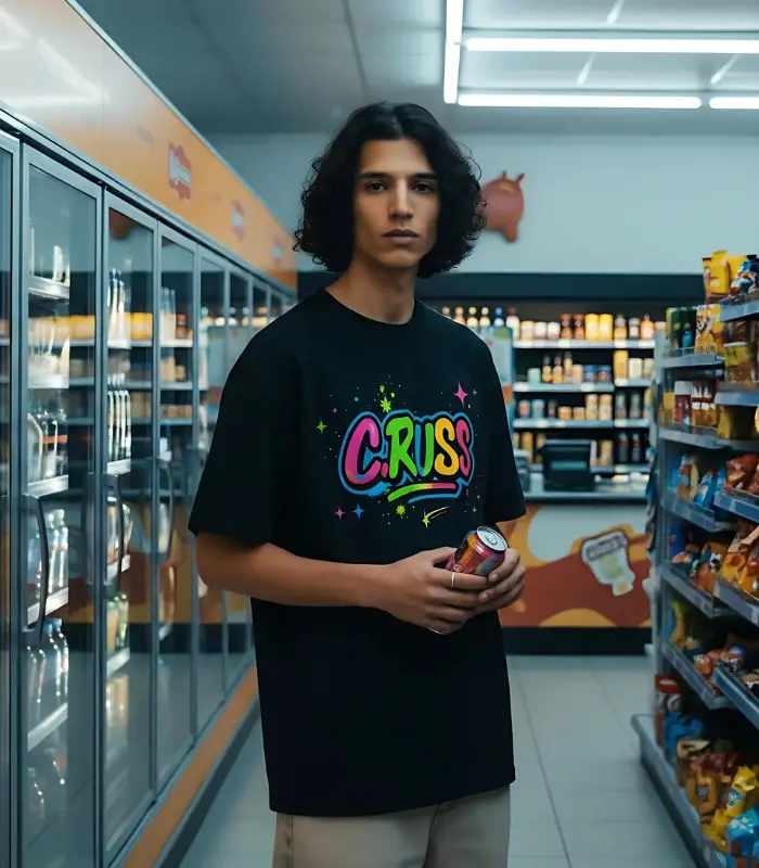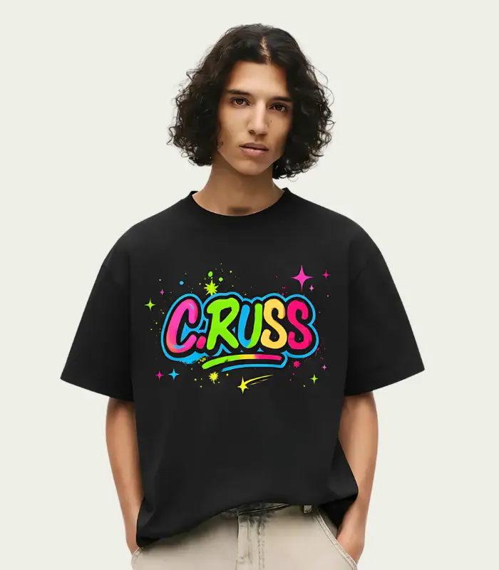 Camiseta negra de corte regular con estampado C.RUSS RSSJ en colores neón. Confeccionada en algodón premium, ideal para destacar en el streetwear urbano.
